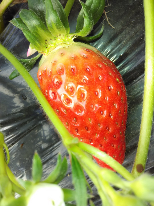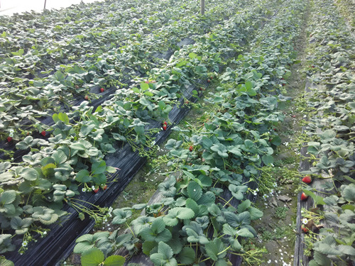 棚內(nèi),大家各自低頭彎腰,踏在一排排田垅中精挑細(xì)選。盡把一個(gè)個(gè)碩大的、色則好的草莓摘下裝在自己的塑料筐內(nèi)。由于怕采摘數(shù)量較多而耽誤時(shí)間,草農(nóng)們自告奮勇地要幫我們一起采摘,被大家婉言拒絕。