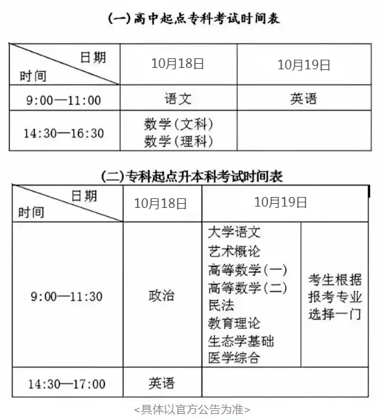 所有統(tǒng)考科目每科試題滿分均為150分。高起專統(tǒng)考科目每科考試時間為120分鐘,專升本每科考試時間為150分鐘。具體時間如下: