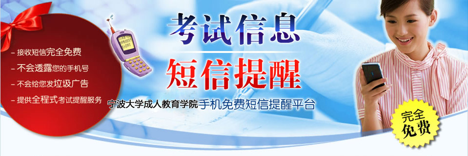 為了使您在百忙之中不會(huì)錯(cuò)過(guò)考試各個(gè)重要環(huán)節(jié),寧波大學(xué)成人教育學(xué)院特開(kāi)通了免費(fèi)訂閱手機(jī)短信提示系統(tǒng)。在考試報(bào)名時(shí)間確定后,系統(tǒng)將自動(dòng)把您當(dāng)?shù)氐膱?bào)名時(shí)間等重要考試信息發(fā)送到您的手機(jī)上。請(qǐng)認(rèn)真填寫(xiě)以下表單,即刻為您開(kāi)通考試相關(guān)提示信息,該短信服務(wù)完全免費(fèi)。
